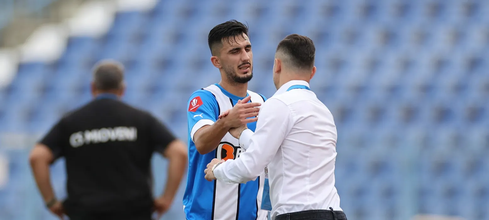 Mirel Radoi il felicita pe Andrei Virgil Ivan la schimbare in meciul de fotbal dintre Universitatea Craiova si CS Mioveni, contand pentru Superliga Superbet, desfasurat pe Stadionul Municipal din Drobeta Turnu Severin, duminica 14 august 2022. © FOTO:Sebastian Tataru/SPORT PICTURES