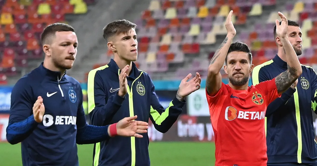 Fotbalistii stelisti Denis Gratian Harut, Ionut Constantin Pantiru, Octavian George Popescu, Alexandru Mihail Baluta, Ovidiu Marian Popescu,Mihai Daniel Lixandru, Florinel Teodor Coman si Joyskim Aurelien Dawa Tchakonte saluta galeria dupa meciul de fotbal dintre FCSB si Universitatea Cluj, din cadrul Superligii Superbet, desfasurat pe Arena Nationala din Bucuresti, luni 2 octombrie 2023. © FOTO:Razvan Pasarica/SPORT PICTURES
