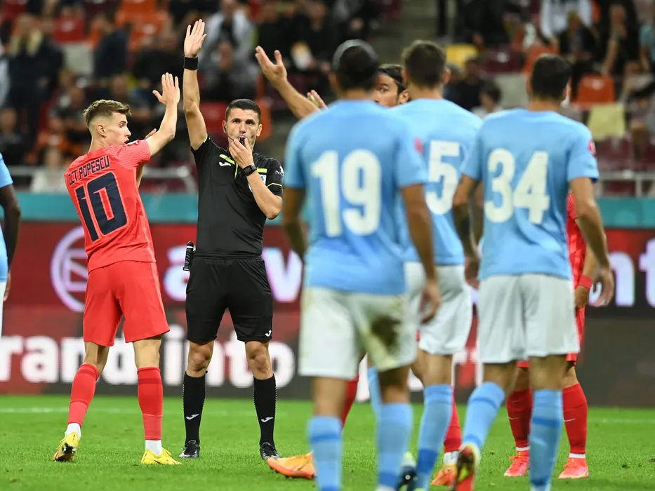 Arbitrul central Marcel Birsan alaturi de Octavian George Popescu in meciul de fotbal dintre FCSB si FC Voluntari, contand pentru Superliga Superbet, desfasurat pe Arena Nationala din Bucuresti, luni 12 septembrie 2022. © FOTO:Razvan Pasarica/SPORT PICTURES