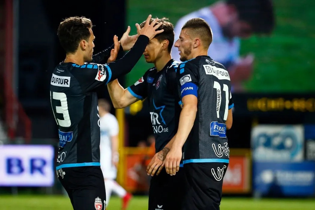 KORTRIJK, BELGIUM - MAY 11 : Dorin Rotariu midfielder of Royal Excel Mouscron scores and celebrates pictured during the Jupiler Pro League Play off 2 match between Kv Kortrijk and Excelsior Mouscron in Kortrijk, Belgium, 11/05/2018.