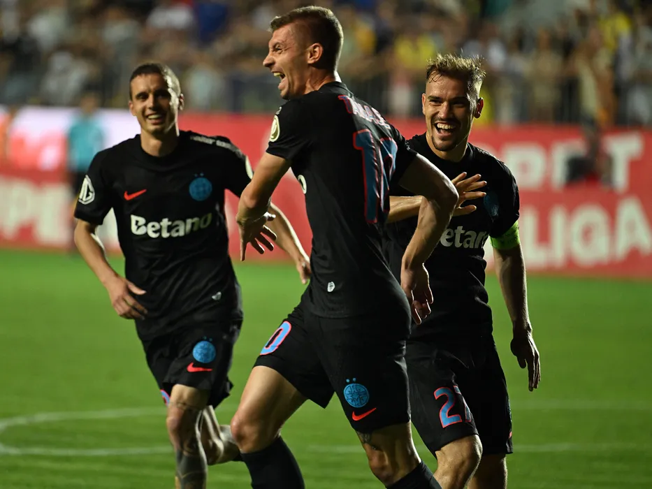 Bucurie a fotbalistilor ros-albastrii Florin Lucian Tănase si Darius Dumitru Olaru dupa un gol marcat in meciul dintre Petrolul Ploiesti si FCSB, contand pentru Superliga Superbet, desfasurat pe Stadionul Ilie Oana din Ploiesti, sambata 19 iulie 2025. © FOTO:Razvan Pasarica/SPORT PICTURES