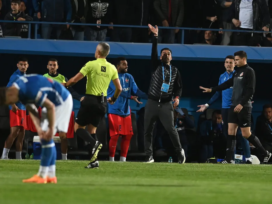 Elias Charalambous reactioneaza alaturi de arbitrul de rezerva Marian Barbu in meciul de fotbal dintre Farul Constanta si FCSB, contand pentru Play-off-ul Superligii Superbet, desfasurat pe Stadionul central al Academiei Gheorghe Hagi din Ovidiu, duminica 21 mai 2023. © FOTO:Razvan Pasarica/SPORT PICTURES