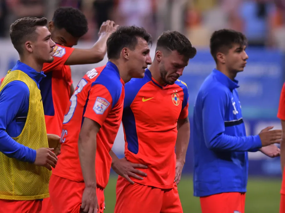 Fotbalistii stelisti Ovidiu Ioan Perianu, Risto Radunovic si Andrei Ioan Cordea parasesc tristi terenul dupa meciul de fotbal dintre FC Voluntari si FCSB, contand pentru Play-off-ul Ligii 1 Casa Pariurilor, desfasurat pe Arena Nationala din Bucuresti, sambata 14 mai 2022. © FOTO:Razvan Pasarica/SPORT PICTURES