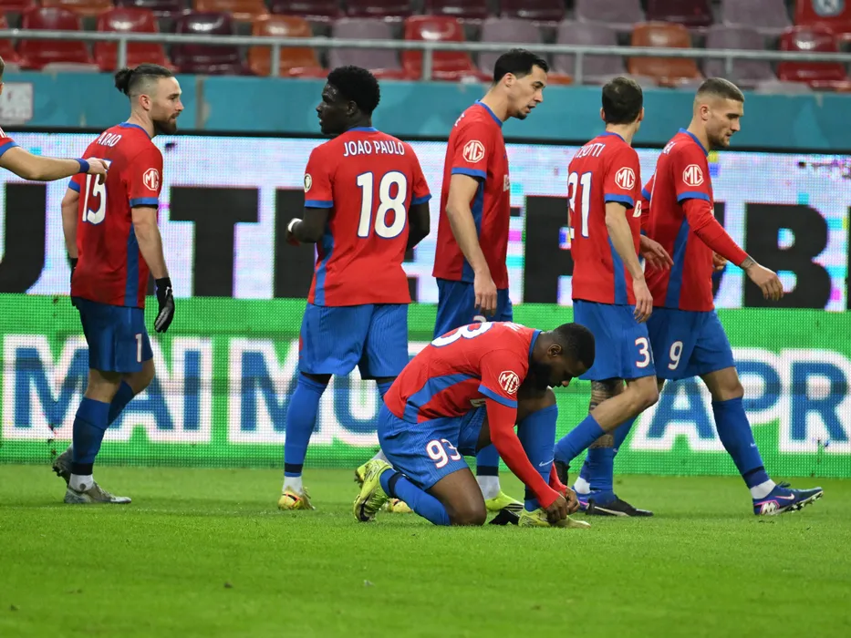 Mamadou Thiam se leaga la siret alături de fotbalistii ros-albastrii Ofri Arad, Joao Paulo Moreira Fernandes, Andre Lourenco Duarte si George Daniel Bîrligea in meciul de fotbal dintre FCSB si Metaloglobus Bucuresti, contand pentru Superliga Superbet, desfasurat pe Arena Nationala din Bucuresti, luni 23 februarie 2026. © FOTO:Razvan Pasarica/SPORT PICTURES