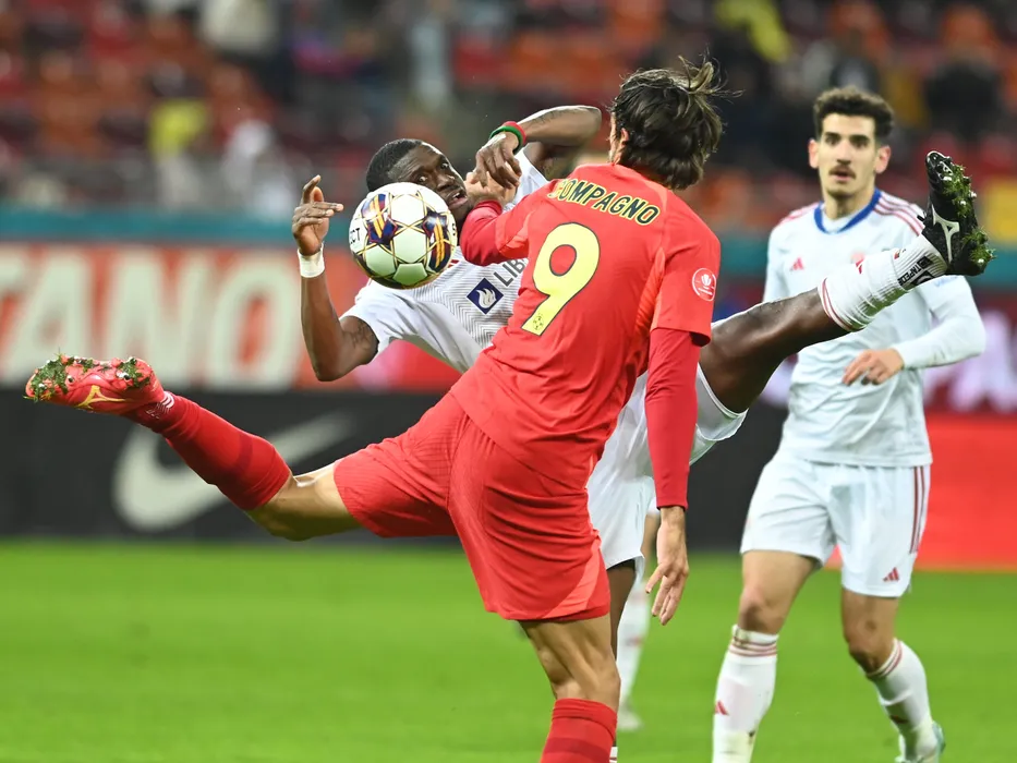 Tobasegnou Francois Yabre si Andrea Compagno in meciul de fotbal dintre FCSB si Otelul Galati, din cadrul Superligii Superbet, desfasurat pe Arena Nationala din Bucuresti, duminica 3 decembrie 2023. © FOTO:Razvan Pasarica/SPORT PICTURES