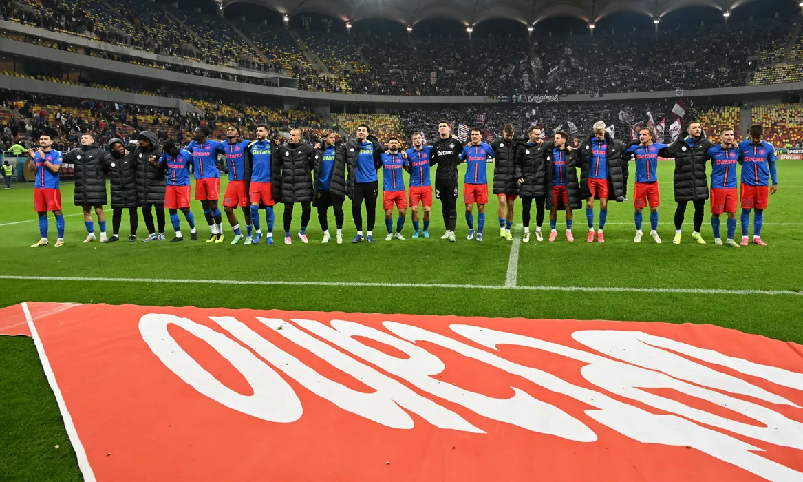 Fotbaliștii steliști Adrian Gheorghe Șut, Florin Lucian Tănase, Siyabonga Ngezana, Malcolm Edjouma, Baba Alhassan, Joyskim Aurelien Dawa Tchakonte, Siyabonga Ngezana, Ionuț Constantin Panțîru, Vlad Iulian Chiricheș, William Guido R Baeten, Andrei Daniel Vlad, Valentin Crețu, Iliuță Daniel Popa, Ștefan Târnovanu, Risto Radunovic, Iliuță Daniel Popa, Grigoraș Alexandru Pantea, Alexandru Mihail Baluță, Octavian George Popescu, Marius Ștefănescu, Ionuț Constantin Panțîru, Darius Dumitru Olaru si Alexandru Marian Musi salută galeria după meciul de fotbal dintre FCSB si Rapid Bucuresti, contand pentru Superliga Superbet, desfasurat pe Arena Nationala din Bucuresti, duminica 27 octombrie 2024. © FOTO:Razvan Pasarica/SPORT PICTURES
