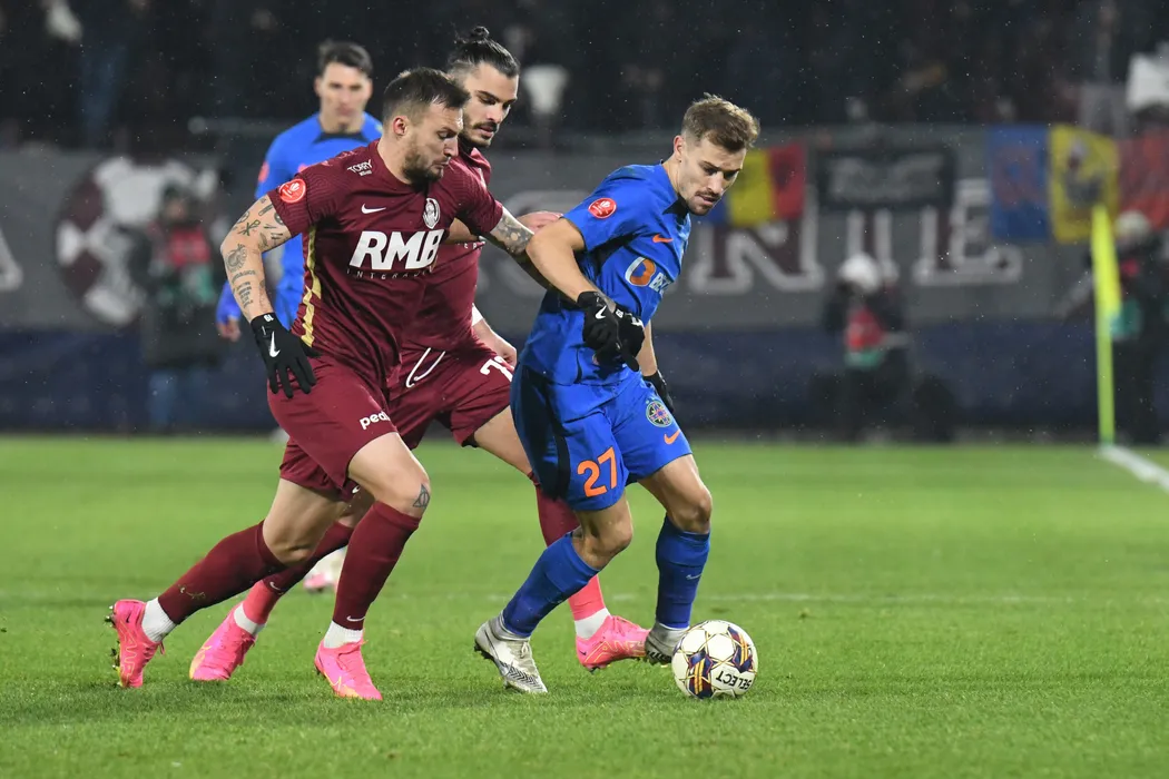Darius Dumitru Olaru și Vasile Mogoș în meciul de fotbal dintre FC CFR 1907 Cluj SA si FC Fotbal Club FCSB SA, contând pentru Superliga Superbet, desfășurat pe Stadionul Dr.Constantin Rădulescu din Cluj-Napoca, duminică 10 decembrie 2023. © FOTO: Flaviu BUBOI/SPORT PICTURES