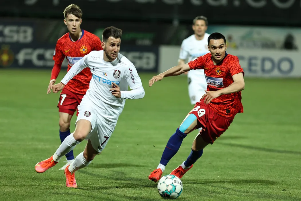 Echipele FCSB (echipament rosu) si CFR Cluj s-au intalnit intr-o partida disputata in etapa cu numarul 5 din play-off-ul Ligii 1 la fotbal, luni 3 mai 2021, in Giurgiu. GEORGE FLUSTER / MEDIAFAX FOTO