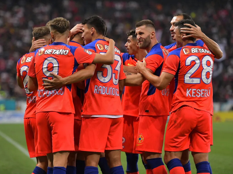 Risto Radunovic, Ovidiu Marian Popescu si Claudiu Andrei Keseru se bucura dupa un gol marcat in meciul de fotbal dintre FCSB si Dinamo Bucuresti, contand pentru Liga 1 Casa Pariurilor, desfasurat pe Arena Nationala din Bucuresti, duminica 12 septembrie 2021. © FOTO:Razvan Pasarica/SPORT PICTURES