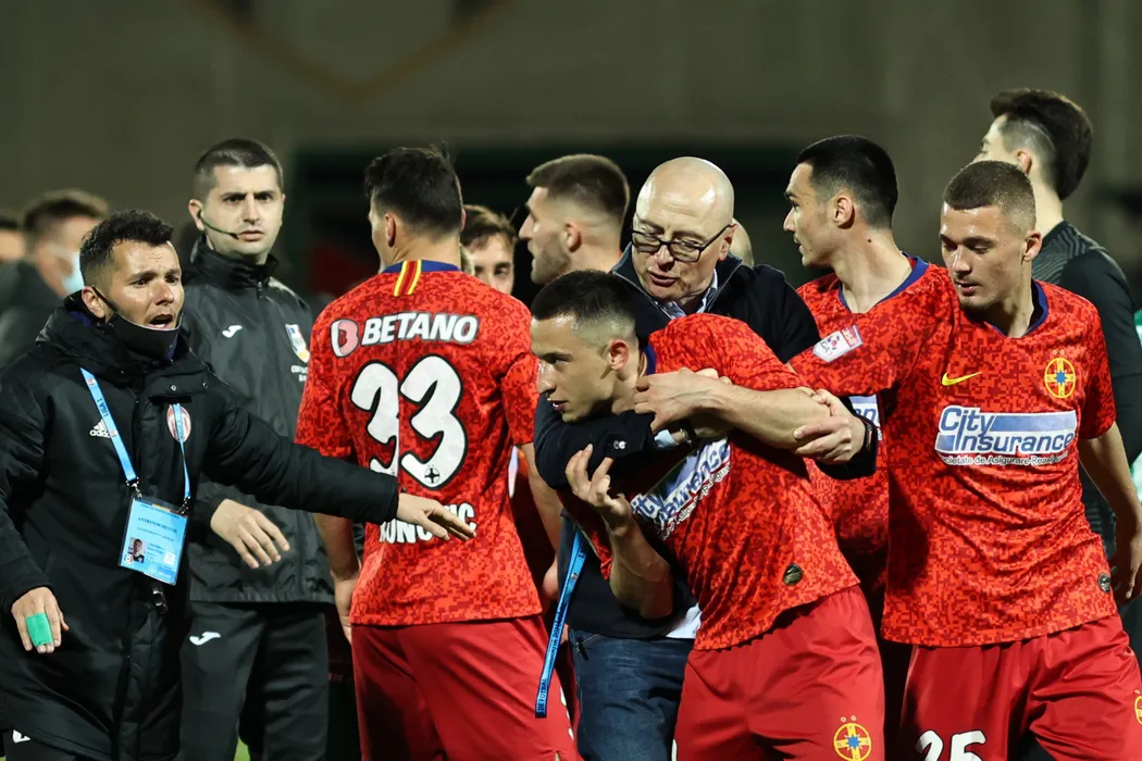 Leontin Grozavu, antrenorul echipei Sepsi OSK, incearca sa-l calmeze pe jucatorul Olimpiu Morutan, la finalul meciului de fotbal contra formatiei FCSB din etapa 3 a play-off-ului Ligii 1, disputat pe stadionul Marin Anastasovici din Giurgiu, duminica, 25 aprilie 2021. GEORGE FILIP / MEDIAFAX FOTO