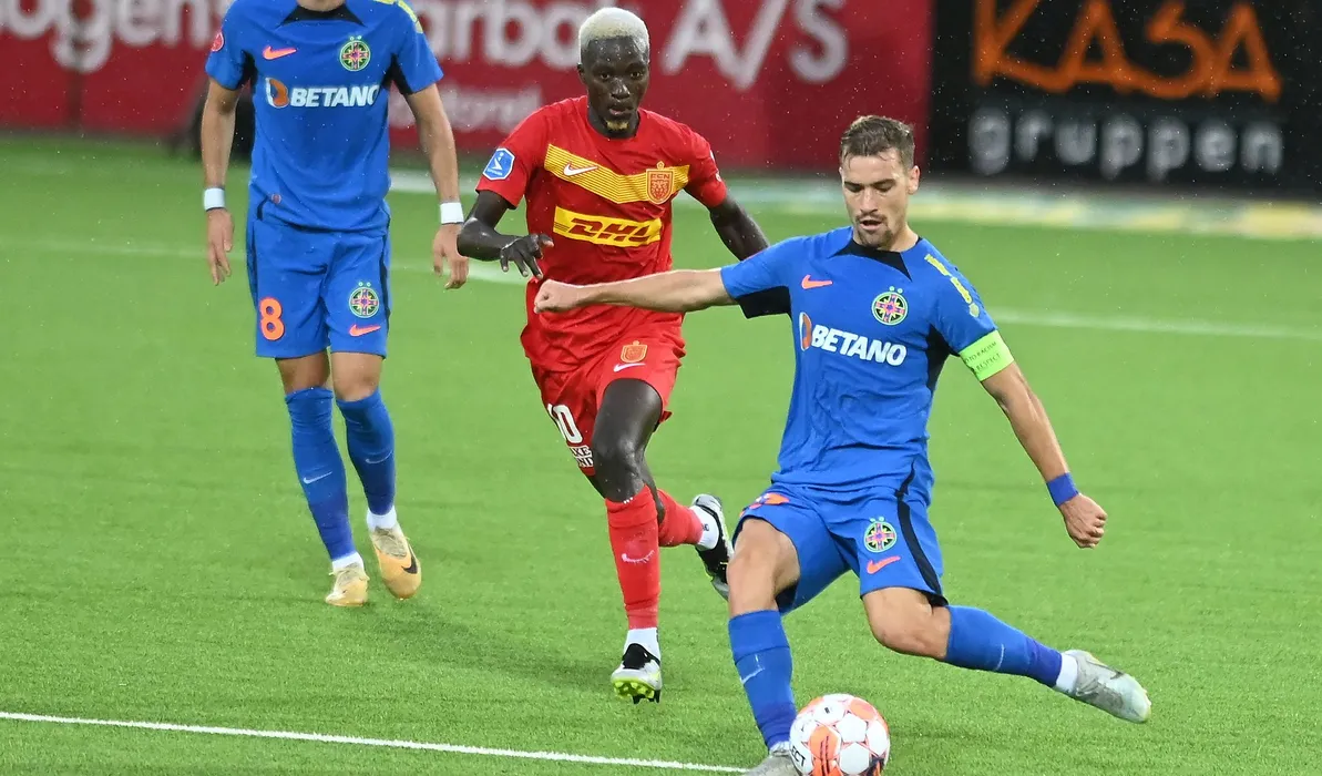 Adrian Gheorghe Sut, Mohamed Diomande si Darius Dumitru Olaru la meciul de fotbal dintre FC Nordsjælland si FCSB, din cadrul UEFA Europa Conference League, desfasurat pe Stadionul Right to Dream Park din Farum, joi 17 august 2023. © FOTO:Razvan Pasarica/SPORT PICTURES