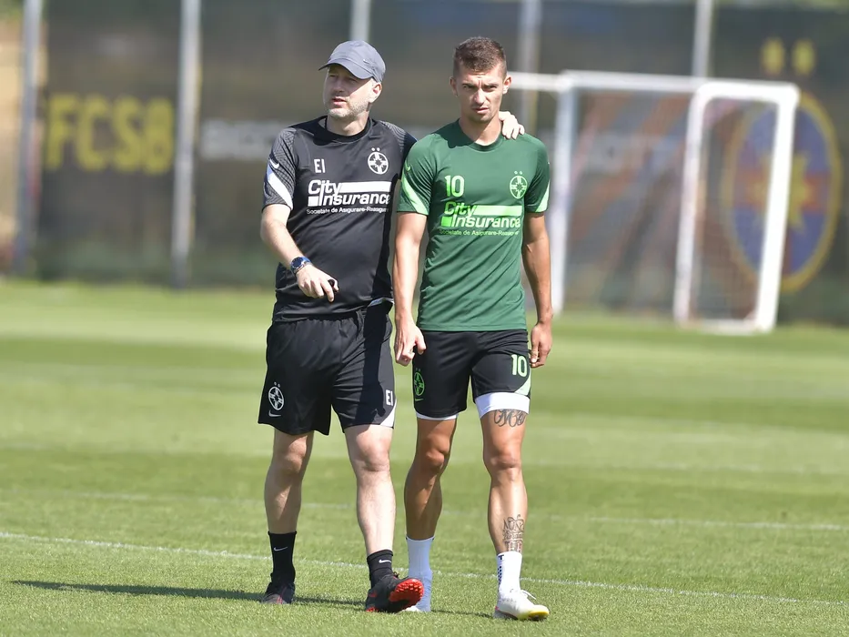 Edward Iordanescu discuta cu Florin Lucian Tanase la antrenamentul fotbalistilor de la FCSB de dinaintea meciului impotriva celor de la Sepsi OSK Sfantu Gheorghe, la Baza de antrenament FCSB din Bucuresti, vineri 20 august 2021. © FOTO:Razvan Pasarica/SPORT PICTURES