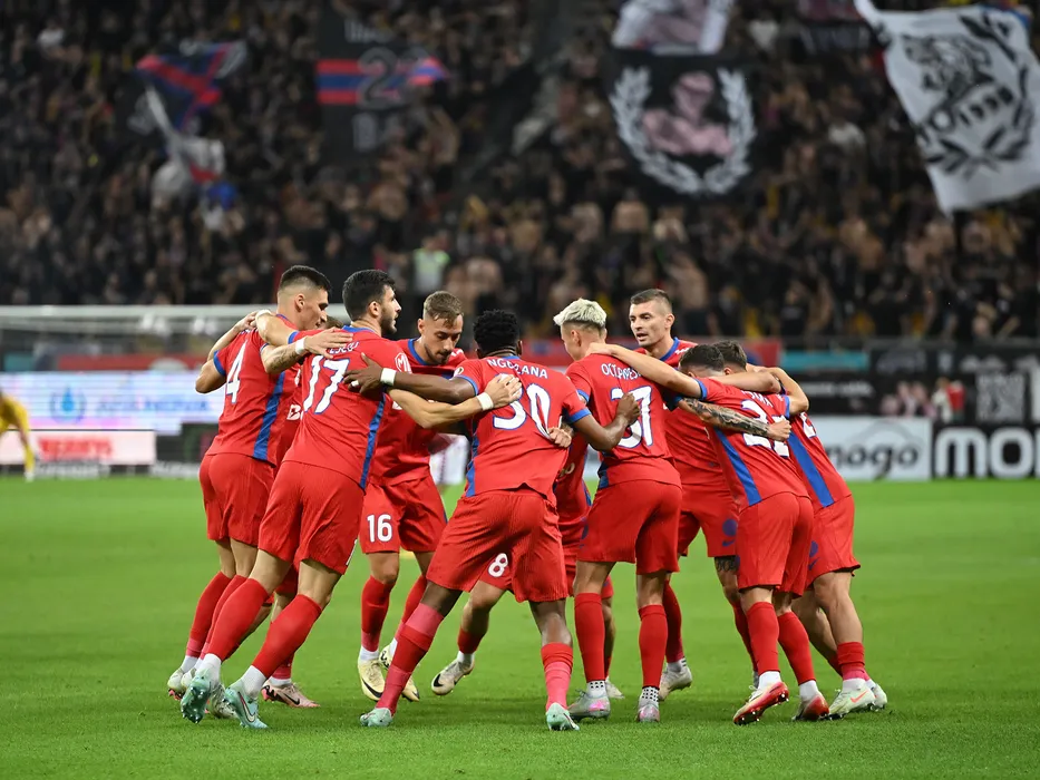 Hora a bucuriei ros albastre cu Daniel Graovac, Mihai Popescu, Mihai Daniel Lixandru, Octavian George Popescu si Florin Lucian Tănase dupa un gol marcat in meciul de fotbal dintre Rapid Bucuresti si FCSB, din cadrul Superligii Superbet, desfasurat pe Arena Nationala din Bucuresti, duminica 17 august 2025. © FOTO:Razvan Pasarica/SPORT PICTURES
