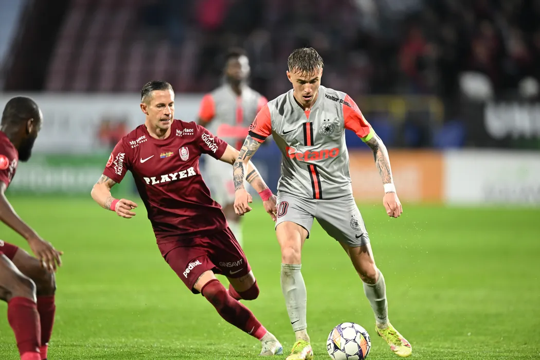 Octavian George Popescu si Ciprian Ioan Deac in meciul de fotbal dintre FC CFR 1907 Cluj si FCSB, contand pentru Superliga Superbet Play-Off, desfasurat pe Stadionul Dr.Constantin Radulescu din Cluj-Napoca, vineri 23 mai 2025. © FOTO: Flaviu Buboi/SPORT PICTURES