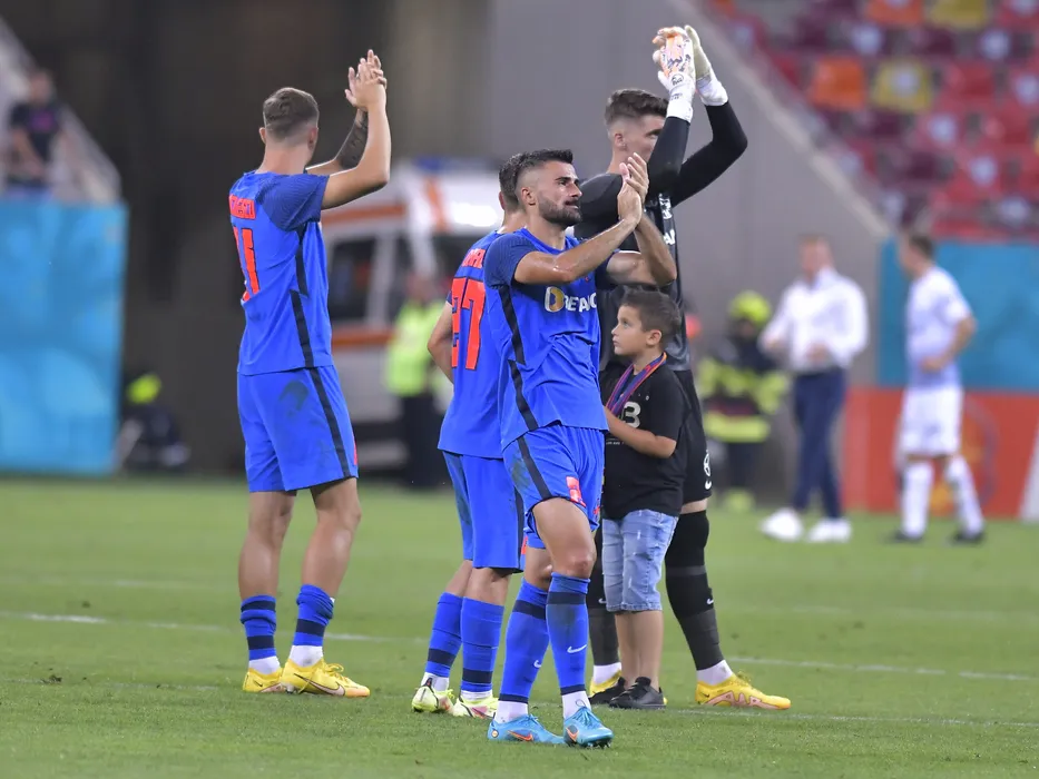 Fotbalistii stelisti printre care Valentin Cretu saluta galeria dupa meciul de fotbal dintre FCSB si FK Viking Stavanger, din cadrul play-off-ului UEFA Europa Conference League, desfasurat pe Arena Nationala din Bucuresti, joi 18 august 2022. © FOTO:Razvan Pasarica/SPORT PICTURES