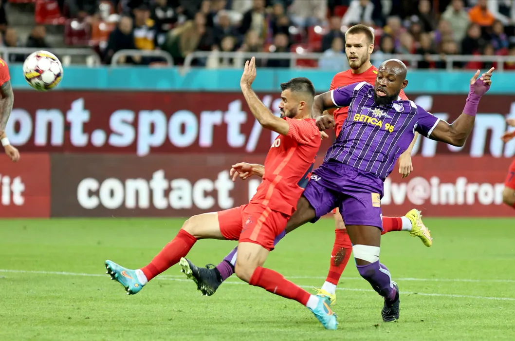 Valentin Cretu (S), de la FCSB, lupta pentru balon cu Mike Cestor (D), de la FC Arges, in meciul de fotbal din etapa a XII-a a Superligii, disputat pe Arena Nationala din Bucuresti, duminica, 2 octombrie 2022. GEORGE FILIP / MEDIAFAX FOTO