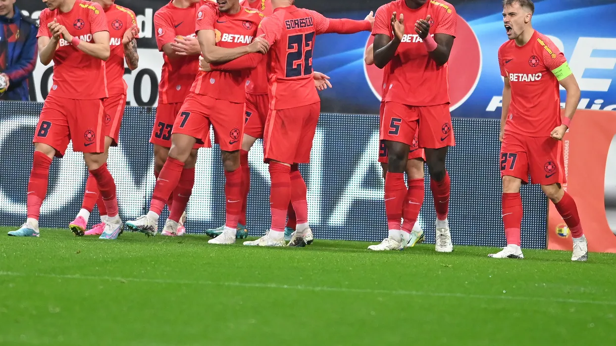 Bucurie a fotbalistilor stelisti dupa un gol marcat cu Adrian Gheorghe Sut, Risto Radunovic, Joonas Tamm, Octavian George Popescu, Florinel Teodor Coman, Joyskim Aurelien Dawa Tchakonte si Darius Dumitru Olaru in meciul de fotbal dintre FCSB si Sepsi OSK Sfantu Gheorghe, contand pentru Play-off-ul Superligii Superbet, desfasurat pe Arena Nationala din Bucuresti, luni 8 mai 2023. © FOTO:Razvan Pasarica/SPORT PICTURES