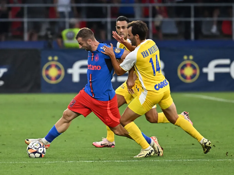 Iliuta Daniel Popa si Joris van Overeem in meciul dintre FCSB si Maccabi Tel Aviv FC, contand pentru Preliminariile Ligii Campionilor, desfasurat pe Stadionul Steaua-Ghencea din Bucuresti, marti 23 iulie 2024. © FOTO:Razvan Pasarica/SPORT PICTURES