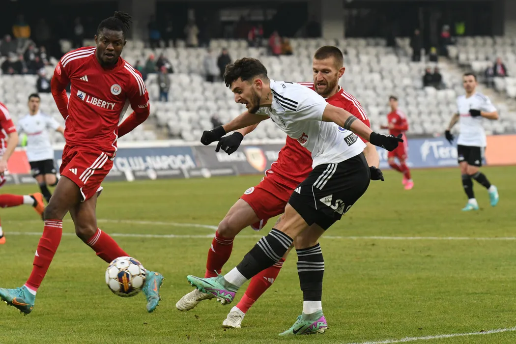 Ianis Ilie Stoica și Milen Zhelev, Jonathan Cisse în meciul de fotbal dintre FC Universitatea Cluj și ACS Suporter Club Otelul Galati contând pentru SUPERLIGA SUPERBET, desfășurat pe Stadionul CLUJ ARENA din Cluj-Napoca, duminică 17 decembrie 2023. © FOTO: Flaviu BUBOI/SPORT PICTURES