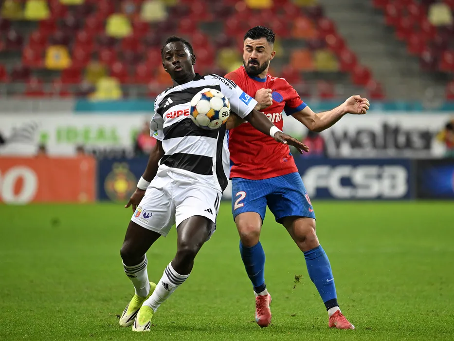 Oucasse N'Dayanthane Mendy si Valentin Cretu in meciul de fotbal dintre FCSB si Universitatea Cluj, contand pentru Superliga Superbet, desfasurat pe Arena Nationala din Bucuresti, sambata 7 martie 2026. © FOTO:Razvan Pasarica/SPORT PICTURES