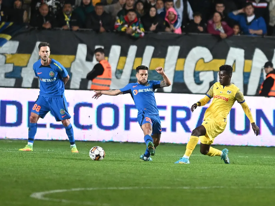 Damjan Djokovic Alexandru Mihail Baluta si Seniko Romeo Doua in meciul de fotbal dintre Petrolul Ploiesti si FCSB, din cadrul Superligii Superbet, desfasurat pe Stadionul Ilie Oana din Ploiesti, sambata 28 octombrie 2023. © FOTO:Razvan Pasarica/SPORT PICTURES
