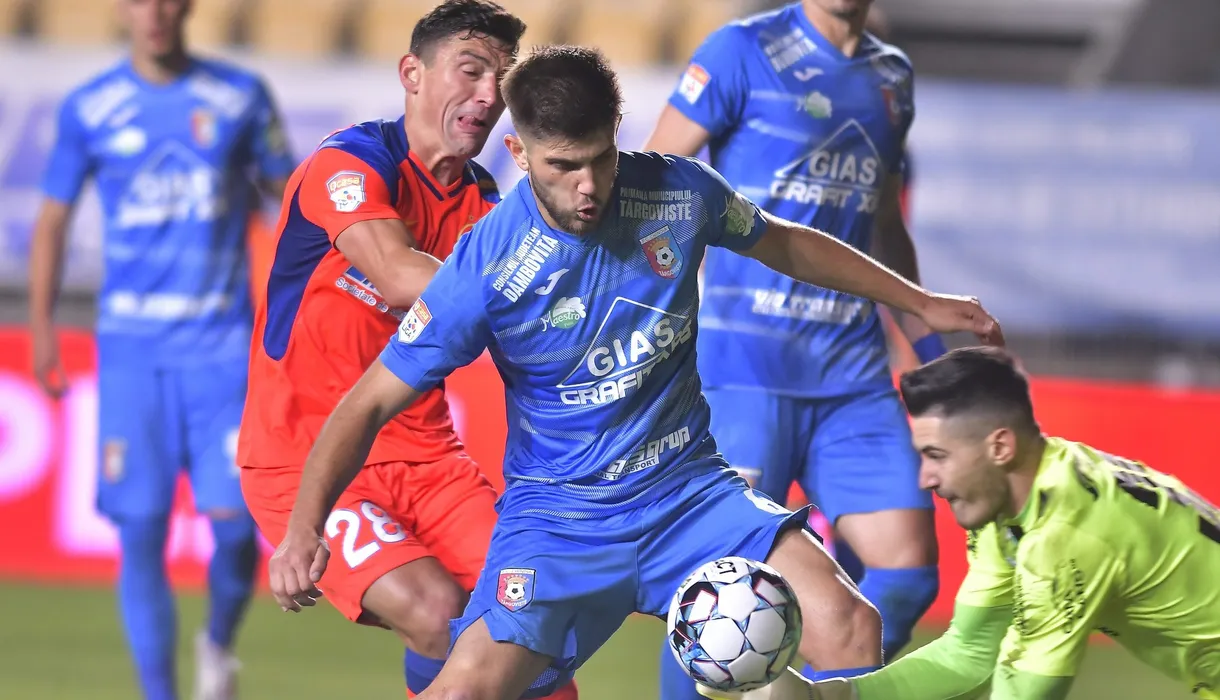 Claudiu Andrei Keseru, Paul Alexandru Iacob si Catalin Vasile Cabuz in meciul de fotbal dintre Chindia Targoviste si FCSB, contand pentru Liga 1 Casa Pariurilor, desfasurat pe Stadionul Ilie Oana din Ploiesti, vineri 1 octombrie 2021. © FOTO:Razvan Pasarica/SPORT PICTURES