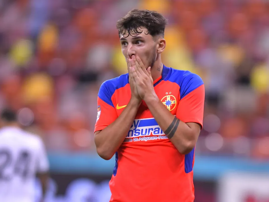 Ianis Ilie Stoica suparat dupa o ratare in meciul de fotbal dintre FCSB si Gaz Metan Medias, contand pentru Liga 1 Casa Pariurilor, desfasurat pe Arena Nationala din Bucuresti, duminica 8 august 2021. © FOTO:Razvan Pasarica/SPORT PICTURES