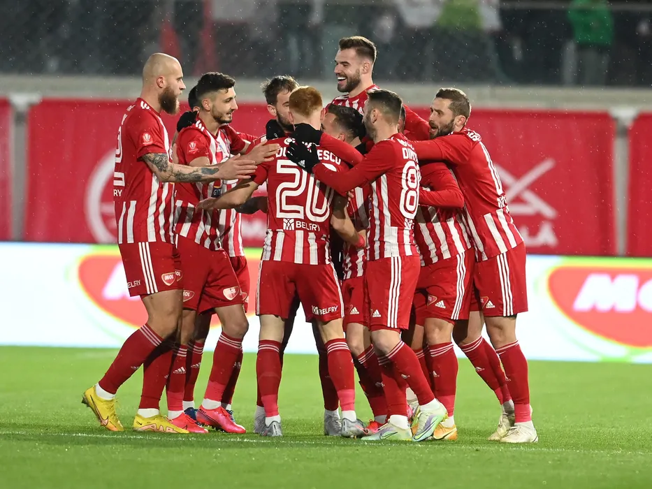 Bucurie a fotbalistilor de la Sepsi dupa un gol marcat cu Branislav Ninaj, Nicolae Ionut Paun, Alexandru Tudorie si Pavol Safranko in meciul de fotbal dintre Sepsi OSK Sfantu Gheorghe si FCSB, contand pentru Play-off-ul Superligii Superbet, desfasurat pe Sepsi Arena din Sfantu Gheorghe, luni 3 aprilie 2023. © FOTO:Razvan Pasarica/SPORT PICTURES