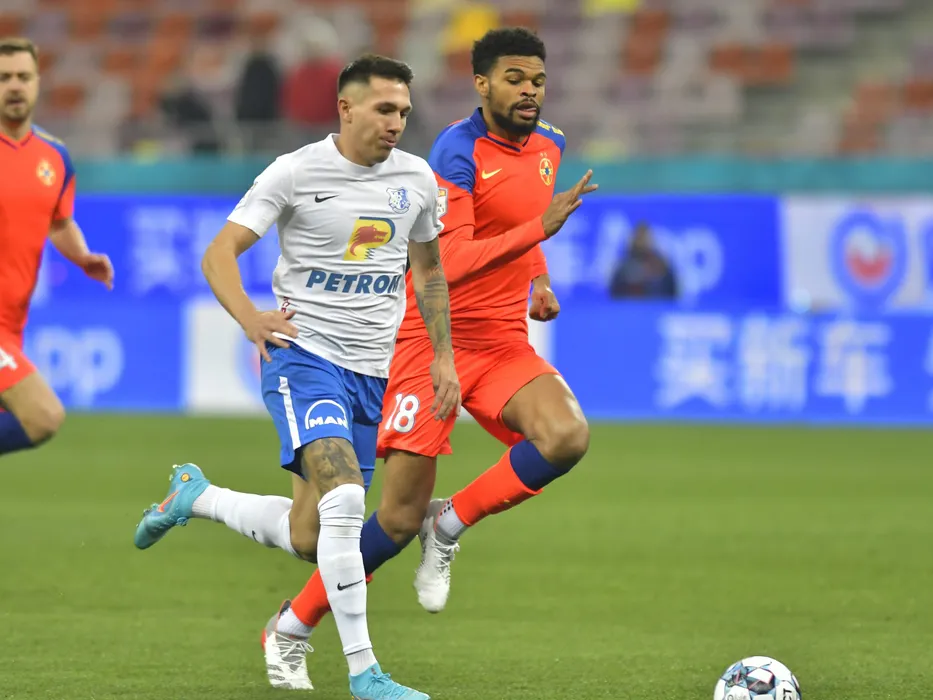 Robert Marian Moldoveanu si Sylas Laouari Edjouma Malcom in meciul de fotbal dintre FCSB si Farul Constanta, contand pentru Play-off-ul Ligii 1 Casa Pariurilor, desfasurat pe Arena Nationala din Bucuresti, luni 14 martie 2022. © FOTO:Razvan Pasarica/SPORT PICTURES
