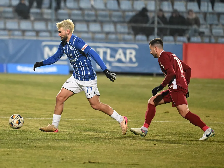 Diogo Sa Ramalho si Constantin Adrian Păun in meciul de fotbal dintre Farul Constanta si CFR Cluj, contand pentru Superliga Superbet, desfasurat pe Stadionul central al Academiei Gheorghe Hagi din Ovidiu, sambata 28 februarie 2026. © FOTO:Razvan Pasarica/SPORT PICTURES