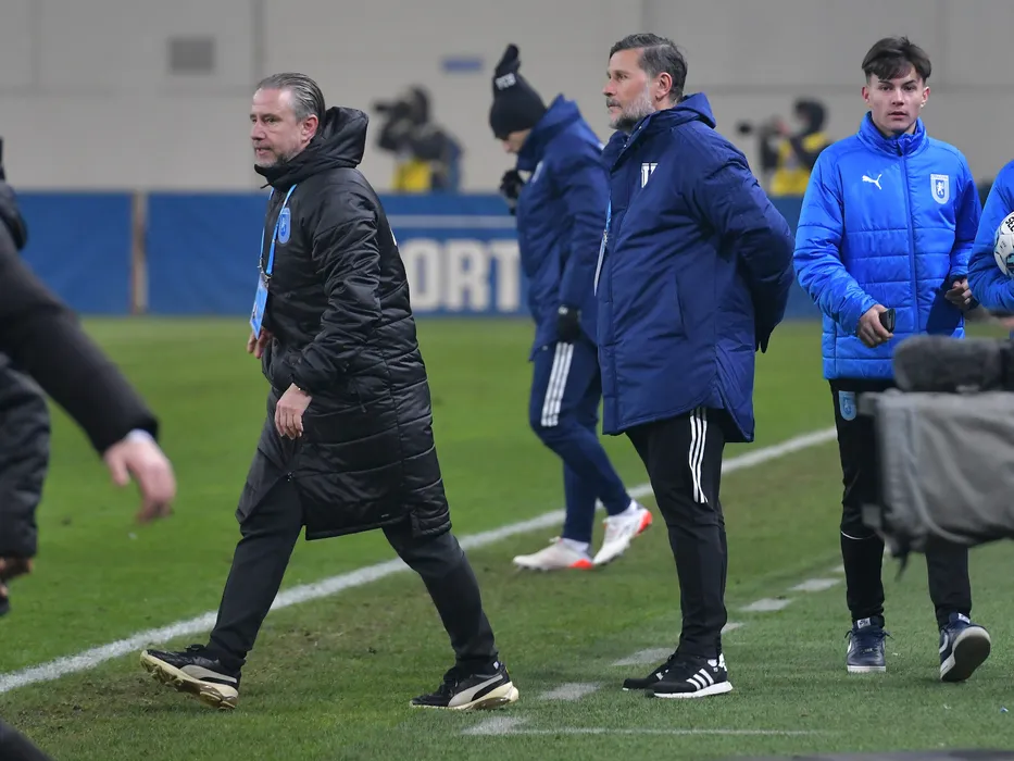 Cei doi antrenori Laurentiu Aurelian Reghecampf si Nicolo Napoli se saluta dupa meciul de fotbal dintre Universitatea Craiova si FC U Craiova, contand pentru Liga 1 Casa Pariurilor, desfasurat pe Stadionul Ion Oblemenco din Craiova, luni 14 februarie 2022. © FOTO:Razvan Pasarica/SPORT PICTURES