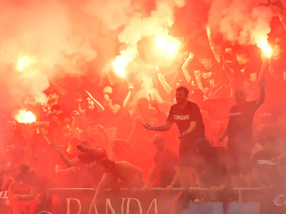 Galeria stelista cu fumigene la meciul de fotbal dintre Dinamo Bucuresti si CSA Steaua Bucuresti, contand pentru Liga 2 Casa Pariurilor, desfasurat pe Arena Nationala din Bucuresti, vineri 9 septembrie 2022. © FOTO:Razvan Pasarica/SPORT PICTURES