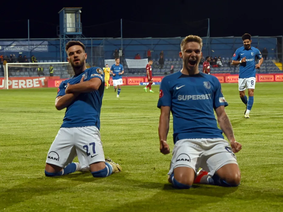 Fotbalistii constanteni Ionuț Sebastian Cojocaru si Louis Munteanu se bucura dupa un gol marcat în meciul de fotbal dintre Farul Constanta si CFR Cluj, contând pentru Play off-ul Superligii Superbet, desfășurat pe Stadionul central al Academiei Gheorghe Hagi din Ovidiu, vineri 19 aprilie 2024. © FOTO: Razvan Pasarica/SPORT PICTURES