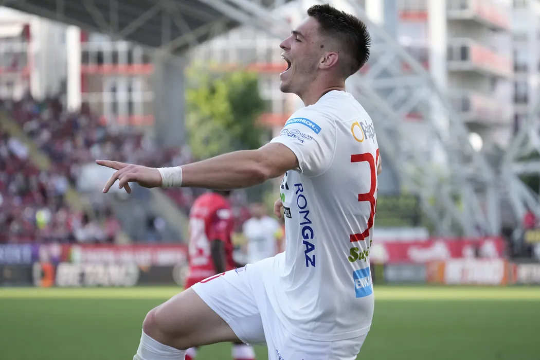 George Daniel Paraschiv după un gol marcat în meciul de fotbal dintre UTA Arad si AFC Hermannstadt Sibiu, contând pentru Superliga Superbet Play-Out, desfășurat pe Arena Francisc Neuman din Arad, vineri 12 aprilie 2024. © FOTO: Alexandra FECHETE/SPORT PICTURES