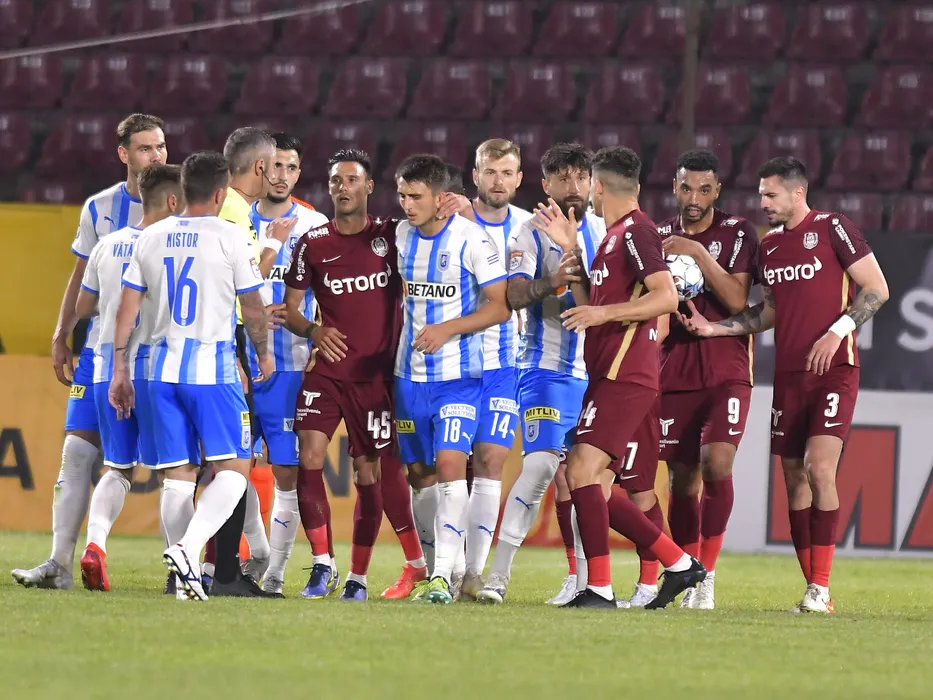 Discutii intre jucatorii Mario Camora, Stefan Marinel Vladoiu, Alexandru Cretu, Paul Papp, Billel Abdel Slem Omrani si Andonie Andrei Burca in meciul de fotbal dintre CFR Cluj si Universitatea Craiova, contand pentru Play-off-ul Ligii 1 Casa Pariurilor, desfasurat pe Stadionul CFR Dr. Constantin Radulescu din Cluj Napoca, duminica 15 mai 2022. © FOTO:Razvan Pasarica/SPORT PICTURES
