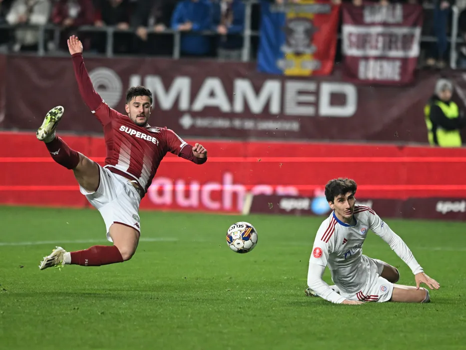 Borisav Burmaz si Miguel Angelo Gomes Silva in meciul de fotbal dintre Rapid Bucuresti si Otelul Galati, din cadrul Superligii Superbet, desfasurat pe Superbet Arena-Giulesti din Bucuresti, sambata 3 februarie 2024. © FOTO:Razvan Pasarica/SPORT PICTURES