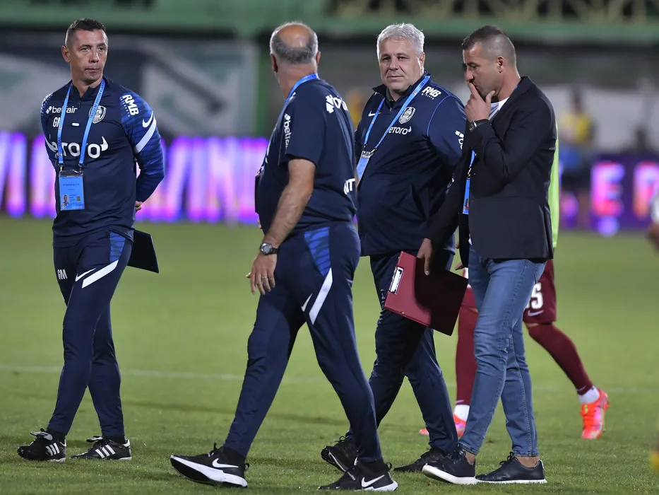 Gabriel Margarit si Marius Sumudica alaturi de Cristian Panin discuta la pauza meciului de fotbal dintre CS Mioveni si CFR Cluj, contand pentru Liga 1 Casa Pariurilor, desfasurat pe Stadionul Orasenesc din Mioveni, sambata 6 august 2021. © FOTO:Razvan Pasarica/SPORT PICTURES