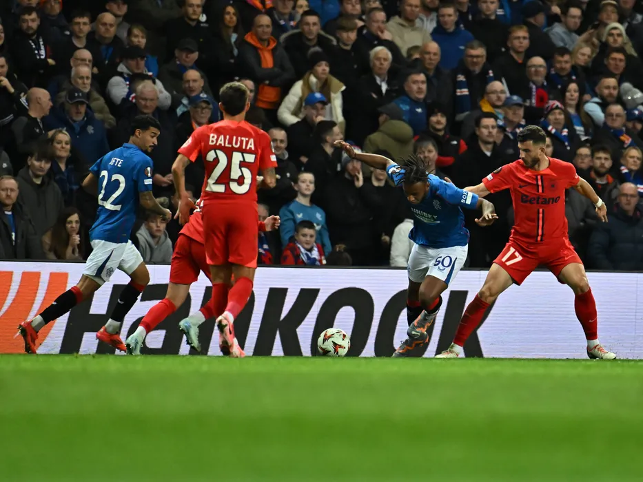 Jefte, Zakariya Lovelace si Mihai Popescu in meciul de fotbal dintre Glasgow Rangers si FCSB, din cadrul UEFA Europa League, desfasurat pe Stadionul Ibrox Park din Glasgow, joi 24 octombrie 2024. © FOTO:Razvan Pasarica/SPORT PICTURES