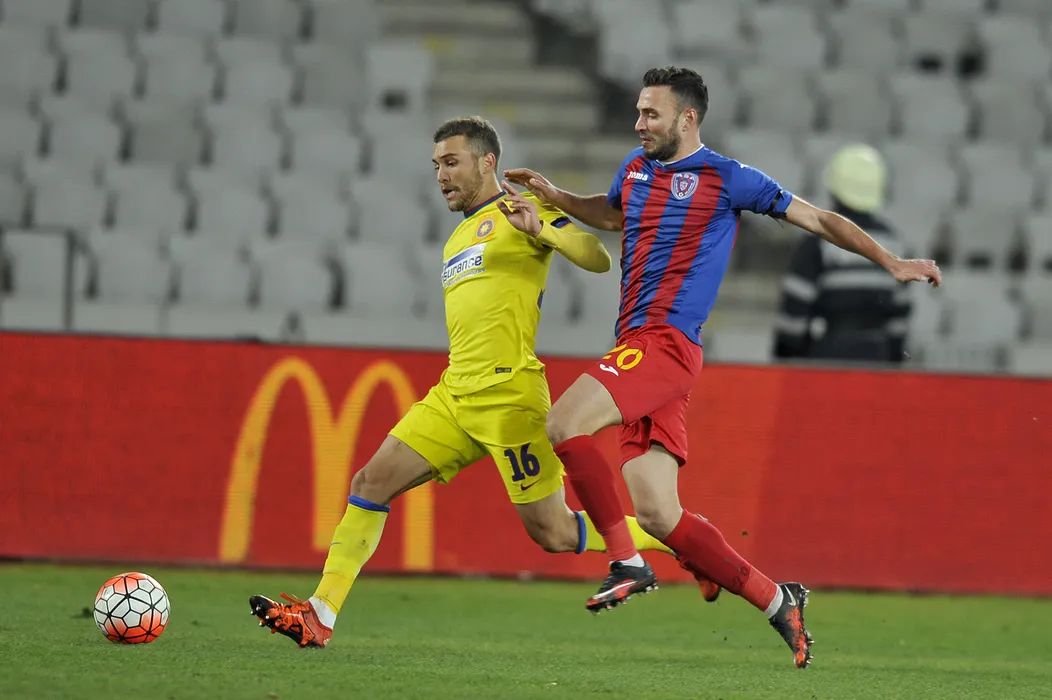 Guilherme Sitya(S) de la Steaua se lupta pentru balon cu Mircea Axente (D) de la ASA Targu Mures, in timpul meciului de fotbal din etapa a XX-a a Ligii I, disputat pe stadionul Cluj Arena din Cluj Napoca, miercuri,2 decembrie 2015. DAN TAUTAN / MEDIAFAX FOTO
