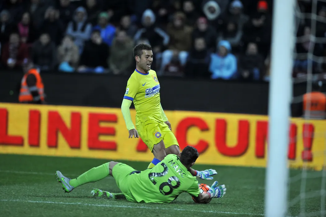 Guilherme Sitya (S), de la Steaua Bucuresti, incearca sa marcheze in timpul meciului de fotbal CFR Cluj - Steaua, din etapa a XVI-a a Ligii I, disputat pe stadionul Constantin Radulescu, din Cluj, duminica, 1 noiembrie 2015. DAN TAUTAN / MEDIAFAX FOTO