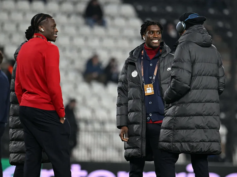 Fotbaliștii ros-albastrii Joyskim Aurelien Dawa Tchakonte si Jordan Youri Gele la inspectia terenului inaintea meciului de fotbal dintre PAOK Salonic si FCSB, din cadrul UEFA Europa League, desfasurat pe Stadionul Toumba din Salonic, joi 13 februarie 2025. © FOTO:Razvan Pasarica/SPORT PICTURES
