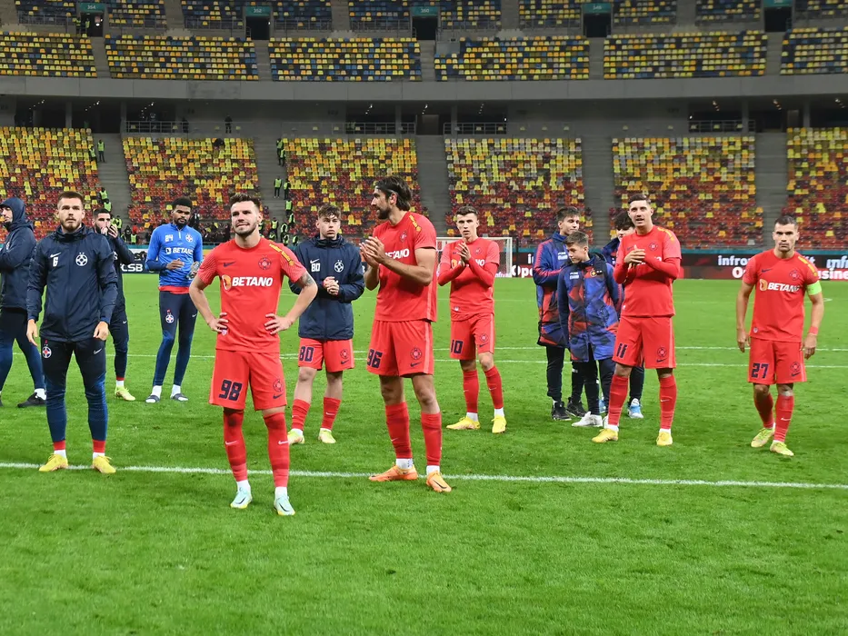 Fotbalistii stelisti Denis Gratian Harut, Andrei Ioan Cordea, Eduard Gabriel Radaslavescu, Andrea Compagno, Octavian George Popescu, David Raul Miculescu si Darius Dumitru Olaru saluta galeria dupa meciul de fotbal dintre FCSB si UTA Arad, contand pentru Superliga Superbet, desfasurat pe Arena Nationala din Bucuresti, duminica 16 octombrie 2022. © FOTO:Razvan Pasarica/SPORT PICTURES