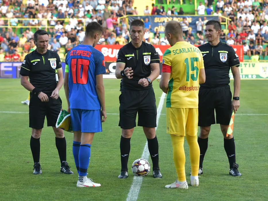 Brigada de arbitri formata din Ciprian Florin Dansa, Szabolcs Kovacs si Stelian Slabu alaturi de capitanii Octavian George Popescu si Manuel Adrian Scarlatache in meciul de fotbal dintre CS Mioveni si FCSB, contand pentru Superliga Superbet, desfasurat pe Stadionul Orasenesc din Mioveni, sambata 6 august 2022. © FOTO:Razvan Pasarica/SPORT PICTURES