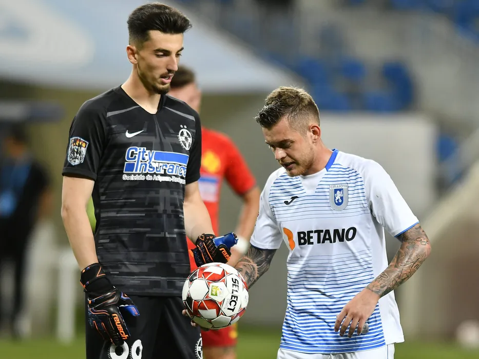 Andrei Daniel Vlad si Alexandru Cicaldau inaintea executarii primului penalty in meciul de fotbal dintre Universitatea Craiova si FCSB, contand pentru play-off-ul Ligii 1 Casa Pariurilor, disputat fara spectatori pe Stadionul Ion Oblemenco din Craiova, duminica 12 iulie 2020. © FOTO:Razvan Pasarica/SPORT PICTURES