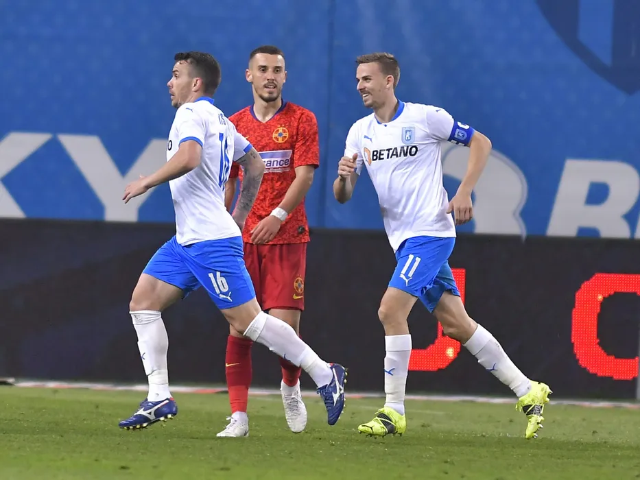 Dan Nicolae Nistor se bucura dupa un gol marcat alaturi de Nicusor Silviu Bancu spre dezamagirea lui Razvan Constantin Oaida in meciul de fotbal dintre Universitatea Craiova si FCSB, contand pentru Play-off-ul Ligii 1 Casa Pariurilor, desfasurat fara spectatori pe Stadionul Ion Oblemenco din Craiova, joi 29 aprilie 2021. © FOTO:Razvan Pasarica/SPORT PICTURES
