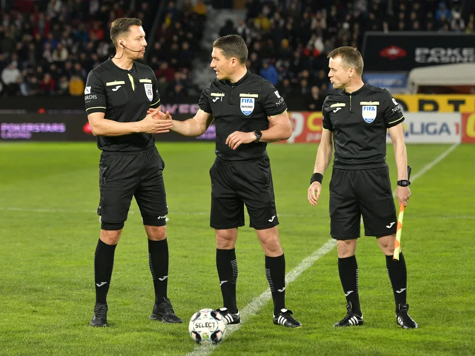 Brigada de arbitri formata din Vasile Marinescu, Istvan Kovacs si Daniel Mitruti la startul meciului de fotbal dintre CFR Cluj si FCSB, contand pentru Play-off-ul Ligii 1 Casa Pariurilor, desfasurat pe Stadionul CFR Dr. Constantin Radulescu din Cluj Napoca, duminica 17 aprilie 2022. © FOTO:Razvan Pasarica/SPORT PICTURES