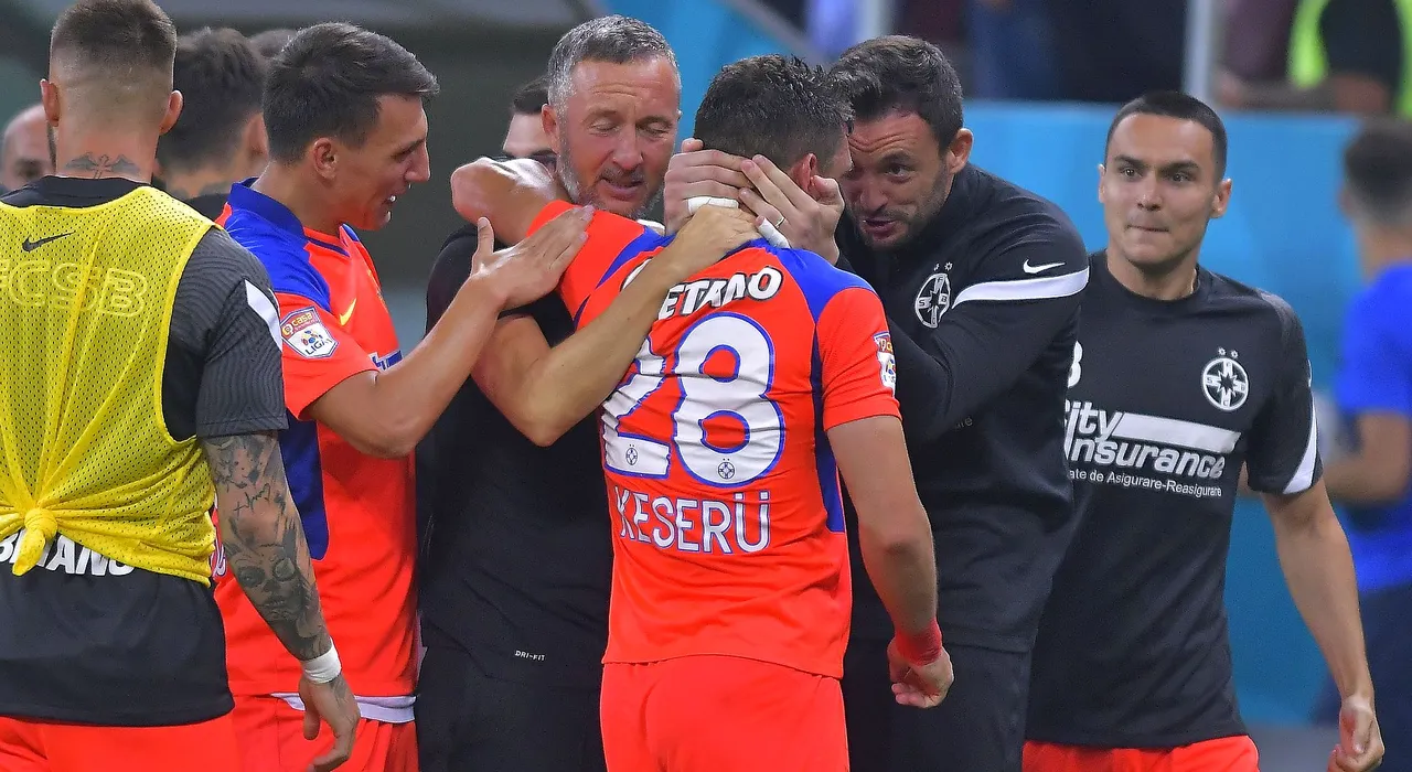 Claudiu Andrei Keseru este felicitat de catre Mihai Stoica si Catalin George Straton dupa un gol marcat in meciul de fotbal dintre FCSB si Dinamo Bucuresti, contand pentru Liga 1 Casa Pariurilor, desfasurat pe Arena Nationala din Bucuresti, duminica 12 septembrie 2021. © FOTO:Razvan Pasarica/SPORT PICTURES