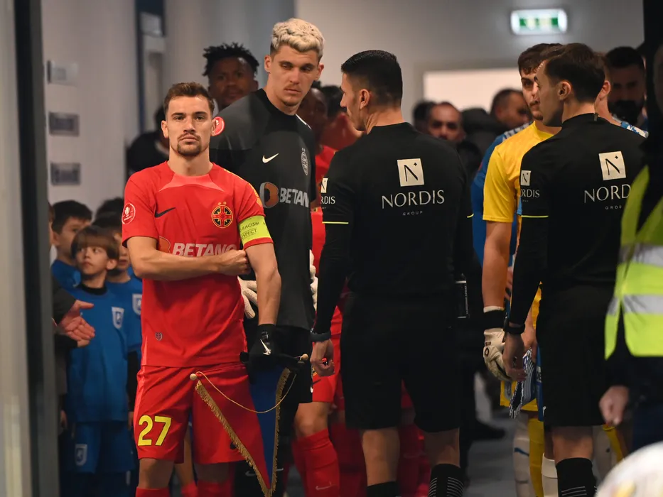 Darius Dumitru Olaru si Ștefan Târnovanu în meciul de fotbal dintre Universitatea Craiova si FCSB, contând pentru Superliga Superbet, desfășurat pe Stadionul Ion Oblemenco din Craiova, duminica 28 ianuarie 2024. © FOTO: Răzvan PĂSĂRICĂ/SPORT PICTURES