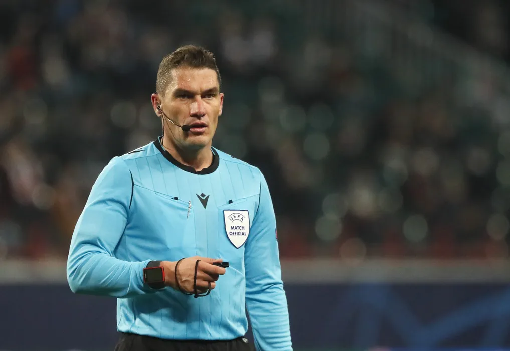 A referee Istvan Kovacs during the Champions League group A soccer match between Lokomotiv Moscow and Bayern Munich in Moscow, Russia, Tuesday, Oct. 27, 2020. (Maxim Shipenkov/Pool via AP)