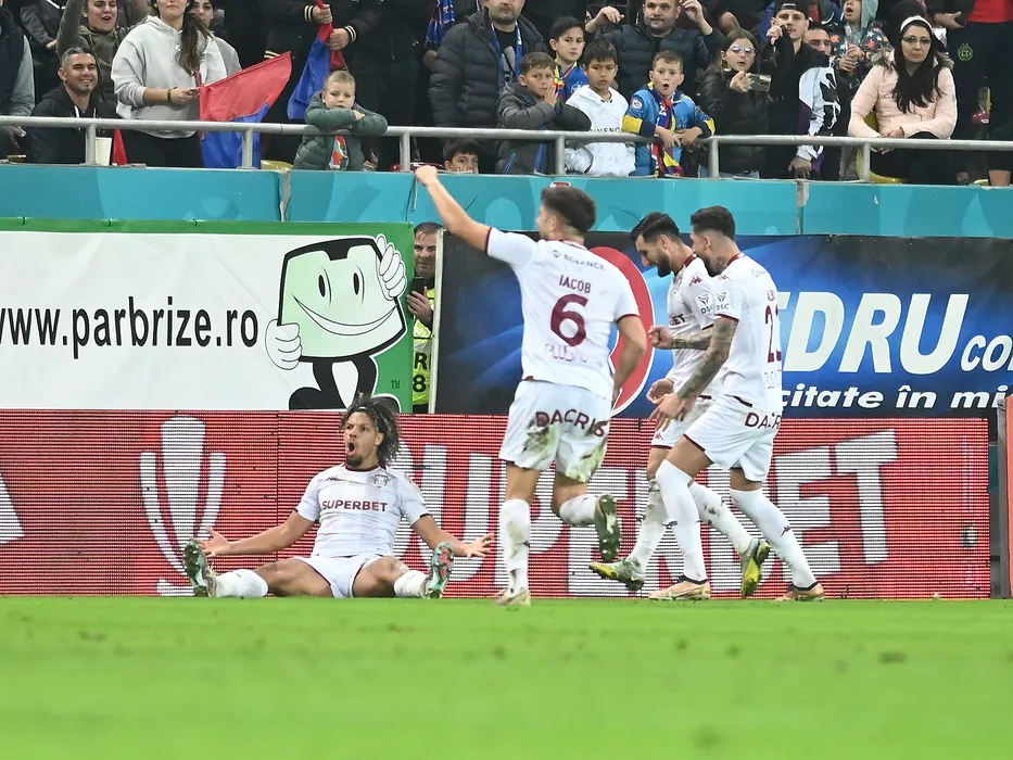 Jayson Jordan Julien Romain Papeau se bucura dupa un gol marcat alaturi de Borja Valle Balonga si Alexandru Cristian Albu in meciul de fotbal dintre FCSB si Rapid Bucuresti, din cadrul Superligii Superbet, desfasurat pe Arena Nationala din Bucuresti, duminica 5 noiembrie 2023. © FOTO:Razvan Pasarica/SPORT PICTURES